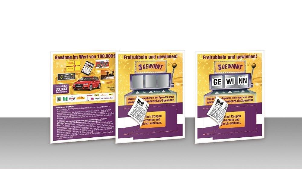 Zwischen dem 1. und 26. März erhalten Teilnehmer Rubbellose mit einem Glücks-Code, wenn sie bei EDEKA, Marktkauf, Esso, Netto Marken-Discount sowie Hammer einkaufen und dabei ihre DeutschlandCard einsetzen. Zusätzlich bekommen Teilnehmer bereits ab dem 15. Februar pro Einkauf bei den teilnehmenden Online-Shops je einen Glücks-Code. Mit den Losen haben sie die Chance auf einen der Hauptgewinne oder einen von 33.333 Sofortgewinnen. Zusätzlich enthält jedes Los einen attraktiven Coupon der Premium Partner oder der mehr als 350 teilnehmenden Online-Shops.