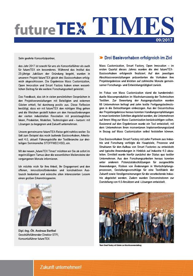 Das Projekt futureTEX ist ein Gewinner im Programm „Zwanzig20 – Partnerschaft für Innovation“ des Bundesministeriums für Bildung und Forschung. Bis 2021 arbeiten wissenschaftliche Einrichtungen, Unternehmen und Verbände an der Entwicklung wesentlicher Bausteine eines Zukunftsmodells für Traditionsbranchen. Das Projektkonsortium futureTEX verfolgt das Ziel, die führende Position bei der Umsetzung der vierten industriellen Revolution im Textilmaschinenbau und in der Textilindustrie zu erringen und damit beispielhaft bis 2030 das modernste textilindustrielle Wertschöpfungsnetzwerk Europas aufzubauen. Mit der Entwicklung eines Zukunftsmodells werden die Forschungsschwerpunkte Ressourceneffizienz und Kreislaufwirtschaft, kundenintegrierte flexible Wertschöpfungsketten, textile Zukunftsprodukte, Wissens- und Innovationsmanagement sowie Arbeitsorganisation und Nachwuchssicherung gemeinschaftlich mit Partnern aus Wissenschaft und Wirtschaft bearbeitet. Vier Basisvorhaben – Smart Factory, Mass Customization, Open Innovation und Arbeitswelt 4.0 – bilden die Grundlage der weiteren Arbeit. Das Projekt futureTEX ist Preisträger im Wettbewerb „Ausgezeichneter Ort“ im Land der Ideen 2016.