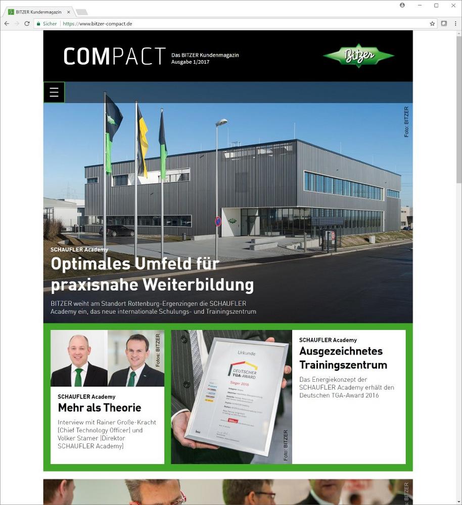 BITZER geht auch bei seinen Unternehmensmedien mit der Zeit und hat sein Kundenmagazin BITZER COMPACT komplett überarbeitet. Statt einer gedruckten Ausgabe erhalten die Kunden nun drei- bis viermal im Jahr einen digitalen Einblick in die BITZER Welt. „Für unsere Kunden bietet das neue Format viele Vorteile“, sagt Patrick Koops, Head of Public Relations im BITZER Headquarter in Sindelfingen. „Unsere Leser können Inhalte direkt über die sozialen Medien teilen und die Redaktion mit nur einem Mausklick kontaktieren. Intern hat sich der Erstellungsprozess beschleunigt, da wir keine Zeit für Druck und Versand einkalkulieren müssen. Außerdem sind wir flexibler in der Gestaltung und können dank Crossmedia sämtliche Kanäle nutzen, um Informationen in spannender Form zu unseren Kunden zu transportieren“, so Koops weiter.