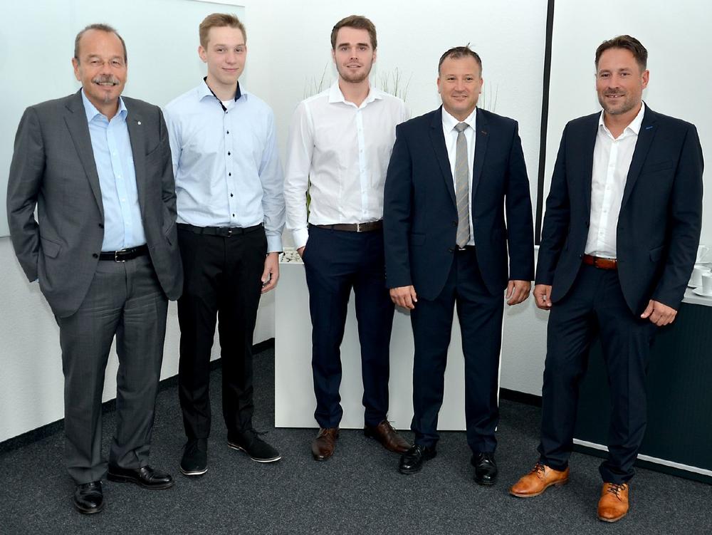 Thomas Janssen (Geschäftsführer Pharmaserv), Jonas Lux und Dennis Dahl (beide Servicemitarbeiter NL Köln), Peter Michael Weimar (Leiter Technik und Instandhaltungsservice) und Markus Weber (Leiter Niederlassungen Deutschland)