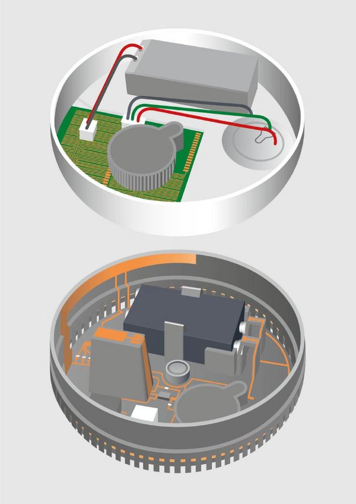Heutige Rauchmelder eignen sich ideal für eine technologische Erneuerung mittels 3D-MID. Das Gehäuse besteht aus Kunststoff – die Leiterbahnen können direkt aufgebracht werden und ersetzten Leiterplatte samt Kabel und Anschlussstecker. Sogar die Batteriehaltung ist im Formteil integriert. In der Produktion entfallen aufwändige Lötprozesse und durch die geringe Anzahl an Bauteilen wird die Montage insgesamt vereinfacht. Weiterer Pluspunkt ist die einfache Integration zusätzlicher Funktionalitäten: Z.B. kommt nun ein kapazitiver Schalter zum Einsatz, der den bisherigen mechanischen ersetzt.
