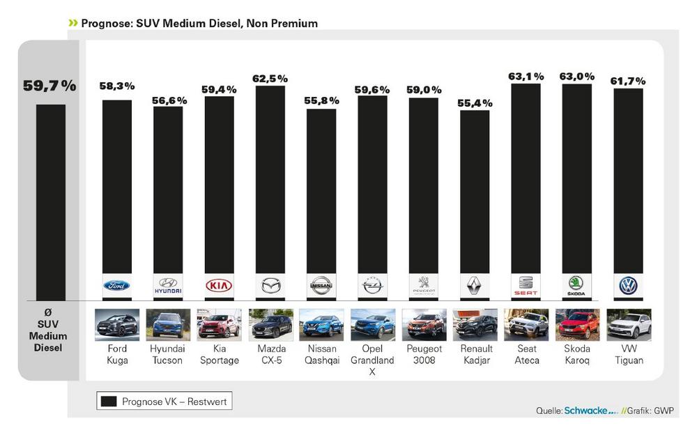 Die hinteren Plätze teilen sich der Renault Kadjar (55,4%), der Nissan Qashqai (55,8%) und der Hyundai Tucson mit 56,6%.