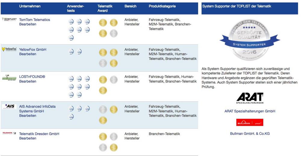 Vor knapp drei Jahren erweiterten wir das Netzwerk "TOPLIST der Telematik" mit der Aufnahme von System-Supporter. Als System-Supporter qualifizieren sich zuverlässige und kompetente Zulieferer der TOPLIST der Telematik. Deren Hardware und Angebote ergänzen die geprüften Telematik-Systeme. Auch System Supporter stellen sich einer jährlichen Prüfung.