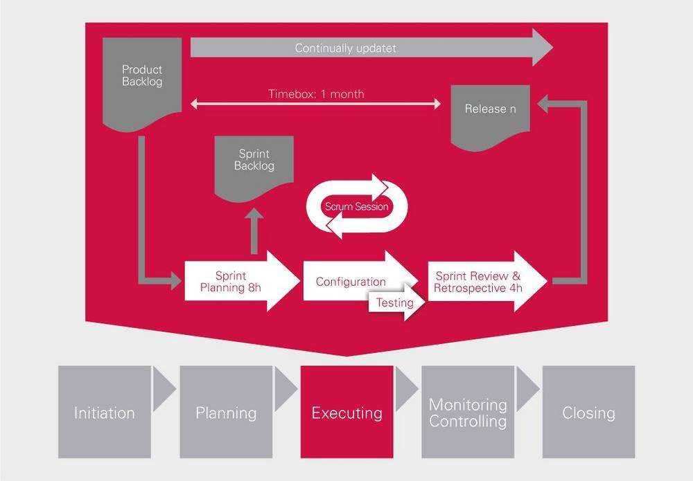 Nach der Initiierung und Planung des Projekts wurde die Implementierungsphase durch die Scrum-typischen Sprints und Events ergänzt. Im regelmässigen Sprint Planning wurden die Inhalte des folgenden Sprints definiert und priorisiert. Der Entwicklungsfortschritt und die Tagesziele wurden mit dem Daily Scrum gemessen und gesteuert. Zur Einhaltung der Qualitätsansprüche im regulierten Umfeld war vor allem das Testvorgehen eines neuen Releases entscheidend. Dabei wurde jedes Release vor der Freigabe als Bestandteil des Sprints vollständig entlang des V-Modells getestet und vom Kunden abgenommen. Nur nach erfolgreicher Abnahme wurde ein Release in der produktiv genutzten Umgebung veröffentlicht.