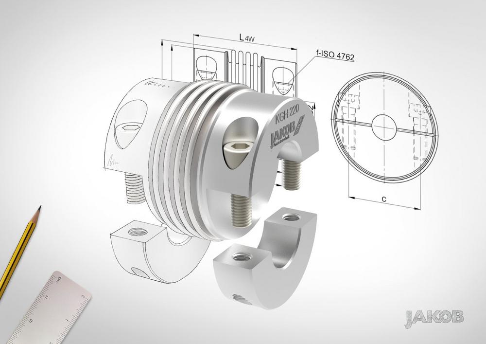 JAKOB Antriebstechnik bietet die Metallbalgkupplung KGH, die in der äußerst montagefreundlichen Halbschalennabenausführung gefertigt wird, auch als Edelstahlvariante an (KGH-VA). Montage und Demontage der Kupplung sind so selbst in beengten Einbauverhältnissen keine Schwierigkeit mehr. Die festen Nabenhälften werden auf die Welle aufgelegt und mit den losen Halbschalenstücken verschraubt. Gerade bei feststehenden Wellenzapfen kann der Servicefall bedeuten, dass die Antriebs- und/oder Abtriebseinheit umständlich demontiert werden müssen, was somit entfällt. Durch die rostfreie Edelstahlbauweise ist sie auch für Einsätze im Lebensmittelbereich hervorragend geeignet.