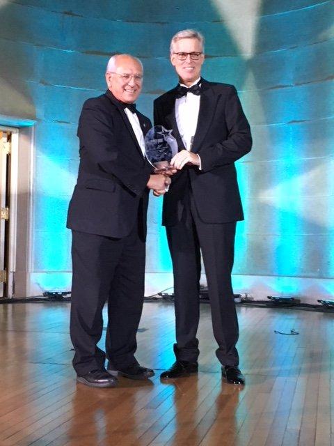 Paul Tonko, Kongressabgeordneter aus New York und Co-Chairman der Sustainable Energy and Environment Coalition, übergab den Preis an Prof. Michael Cesarz, CEO MULTI bei thyssenkrupp Elevator.