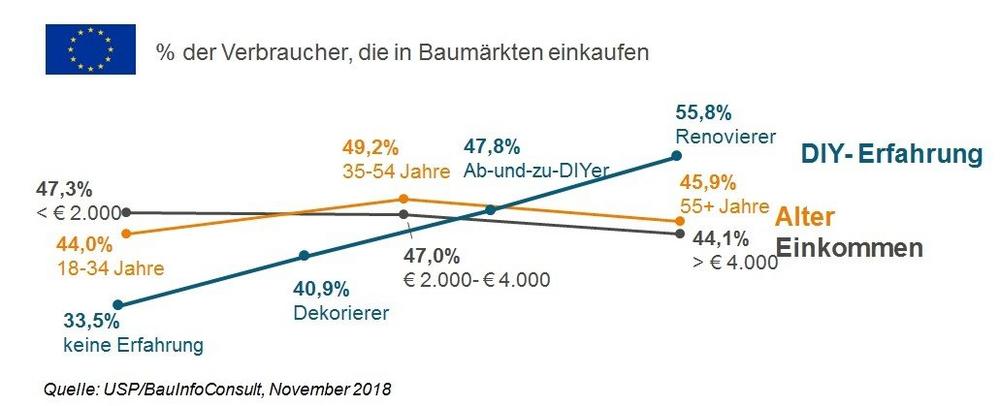 Der wichtigste Faktor, der die Intensivität der DIY-Nutzung bei Verbrauchern bestimmt, ist natürlich die eigene Erfahrung als Heimwerker. Im Rahmen der europäischen Messungen von USP Marketing Consultancy lassen sich vier Typen unterscheiden: die Heimwerker-Frischlinge ohne Erfahrung, die bloßen Dekorierer, die sich vor allem rund um Haus und Garten austoben, die Ab-und-zu-Heimwerker sowie schließlich die Renovierer. Die Renovierer besuchen die Baumärkte am intensivsten (zu 55,8 Prozent), gefolgt von den Gelegenheits-Tüftlern mit einem Anteil von 47,8 Prozent. Die Dekorierer sind zuletzt mehr von den die Marketing-Abteilungen der Baumarktketten ins Visier genommen worden, landen aber dennoch auf dem zweitletzten Platz vor den Neulingen.
