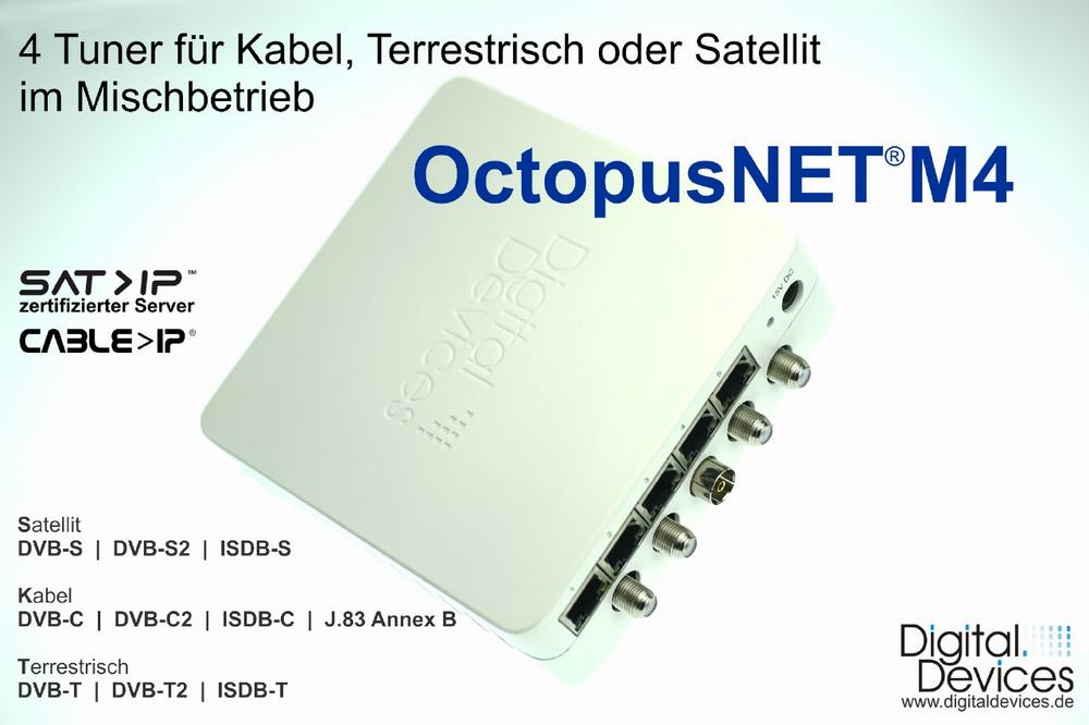 Digital Devices GmbH, ein führender Entwickler und Anbieter von DVB Produkten, hat ein neues Produkt in der OctopusNET® Reihe realisiert. Hinter der Bezeichnung OctopusNET® M4 verbirgt sich eine Lösung, die alle gebräuchlichen DVB – Standards verarbeiten kann. Es handelt sich um eine vier Tuner-Box, die sowohl Satellit (S/S2/ISDB-S), als auch Kabel (C/C2/ISDB-C) oder Antenne (T/T2 /ISDB-T) empfangen kann.