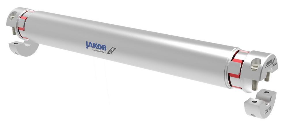 Außer den Verbindungswellen der Reihen WDS, WDE und WD-VA bietet Jakob noch eine weitere Standardbaureihe und kundenspezifische Lösung für die Überbrückung großer Achsabstände an: Die auf Elastomerkupplungen der Reihe EKH basierende Reihe EKHZ. Der Einsatzbereich der Reihe EKHZ liegt hauptsächlich in Anwendungen mit mittleren Betriebsdrehzahlen. Sie deckt einen Drehmomentbereich von 20 bis 1600 Nm ab und erlaubt maximale Drehzahlen von 3500 U/min bei der minimalen Länge von 50 cm. Sie eignet sich für Wellendurchmesser von 10 bis 100 mm. Allgemein beträgt die erreichbare maximale Länge der Reihe EKHZ drei Meter. Die Reihe EKHZ erlaubt es, Schwingungen effizient abzubauen. Der Grad der Schwingungsdämpfung lässt sich durch die Shorehärte der Ausgleichselemente anpassen. Die verwendeten Kunststoffsterne bieten zwei Vorteile: auch ohne Halbschalenausführung lassen sich die Kupplungen, da steckbar, einfach montieren. Zudem wirkt der Kunststoff thermisch und elektrisch isolierend. Aufgrund der Eigenschaften des verwendeten Materials können diese Kupplungen nur bis 90°C eingesetzt werden, wobei sich das zulässige Übertragungsdrehmoment mit zunehmender Temperatur reduziert.