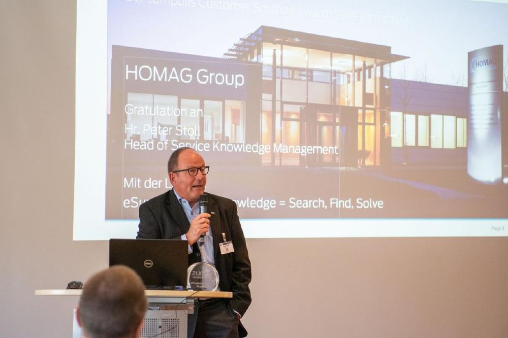 Empolis würdigte mit der Auszeichnung die Lösung "eSupport" von HOMAG. Ein intelligentes System, das allen Servicetechnikern den schnellen Zugriff auf über 2 Millionen Dokumente über mehrere Tausend Maschinen ermöglicht. Im Durchschnitt hat "eSupport" die benötigte Zeit für einen Serviceauftrag inzwischen um etwa 10 Prozent reduziert, was Mitarbeiter und Kunden zufriedener macht und gleichzeitig Kosten senkt.