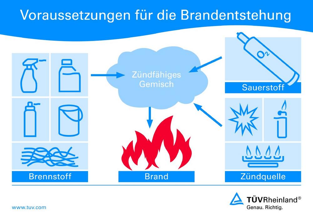 Ob und wie gut ein Stoff brennt, hängt von verschiedenen Faktoren ab. Während ein Holzscheit bei Funkenflug aufgrund von Schweißarbeiten nur schwelt, fangen Holzspäne oder Holzwolle deutlich leichter Feuer. Fein in der Luft verteilter Holzstaub kann sogar explodieren. Neben dem Brennstoff müssen für die Brandentstehung ausreichend Sauerstoff und eine Zündquelle zur Verfügung stehen. „Bei einer Zündquelle handelt es sich nicht immer um den sprichwörtlichen Funken: Auch heiße Oberflächen, ein heiß gelaufenes Lager an einer Maschine, chemische Reaktionen oder zusammen mit Stahlwolle gelagerte Batterien können Brände auslösen. Mitarbeiter, die mögliche Brandursachen in ihrem Arbeitsbereich kennen, können auf solche Gefährdungen gezielt hinweisen und für Abhilfe sorgen. Damit leisten sie einen wichtigen Beitrag zum Arbeits- und Gesundheitsschutz im Unternehmen“, so der Experte.