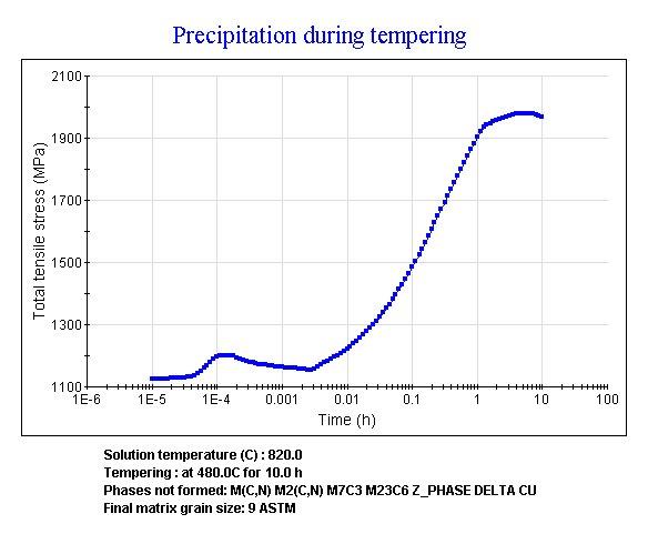 In der neuen Version 11 erlaubt JMatPro nun die Berechnung eines Festigkeitsverlaufes über die Auslagerungsdauer. Hier wird Volumen%, Größe und Festigkeit der einzelnen ausgeschiedenen Partikel berechnet, wodurch der Einfluss dieser Phasen (Laves etc.) auf die Festigkeit bewertet werden kann.