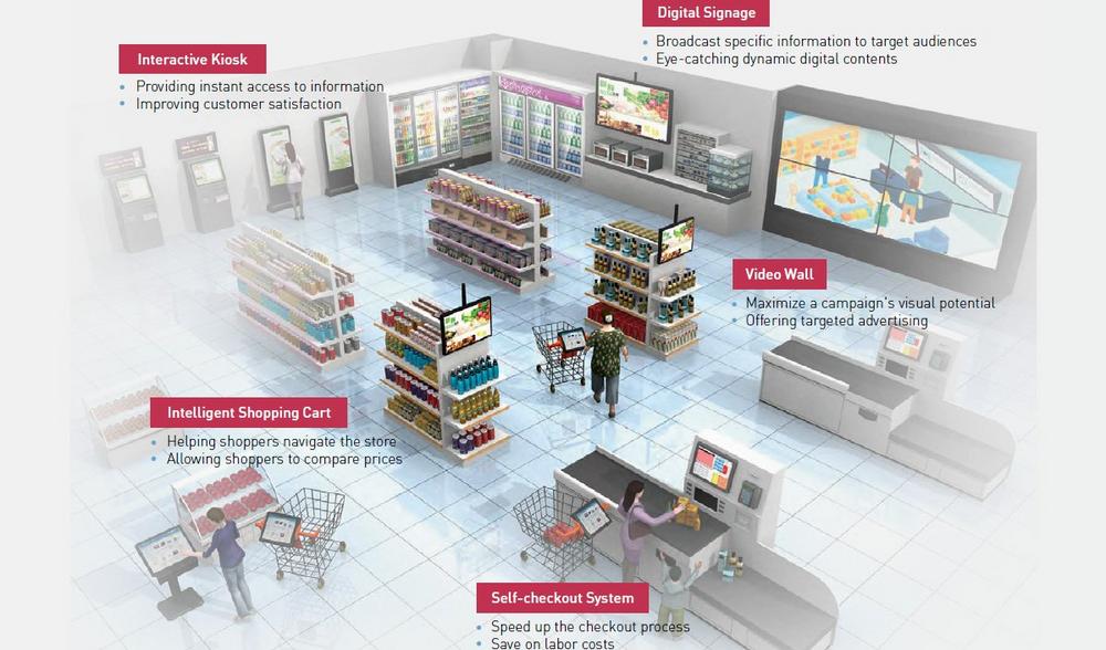 Unsere erste smarte Verbesserungsmöglichkeit im Einzelhandel sind interaktive digitale Bildschirme. Es kann nicht nur Werbung geschaltet, sondern auch über Veranstaltungen und Rabattaktionen informiert werden. Der Content kann dabei immer auf die jeweilige Zielgruppe und Tageszeit angepasst werden. Stellen Sie sich hierzu einen Sommervormittag bei 30 Grad Außentemperatur vor. Ein Digital Signage System gibt im Supermarkt eine Wettervorhersage, ein anderes macht auf ein Großevent, die Fußball Weltmeisterschaft, aufmerksam. Eine Videowand zeigt wiederum, welche Produkte zu einem Grillnachmittag gehören – Grillfleisch, Salat, Gemüse und eisgekühlte Getränke. Dem Supermarkt ist es dadurch möglich, auf verschiedene Kundengruppen einzugehen und diese bei ihrem Einkauf zu unterstützen. Für interaktives Digital Signage eignet sich besonders die SDM-Serie von AXIOMTEK, die mit hoher Rechen- und Grafikleistung punktet. Sie ist kostengünstig, schnell zu installieren und leicht zu warten. Damit Kunden auch selbst nach bestimmten Informationen suchen oder Leistungen einer Kundenkarte in Anspruch nehmen können, werden Kiosksysteme wie das ITC150WM-200S in ein Geschäft integriert.