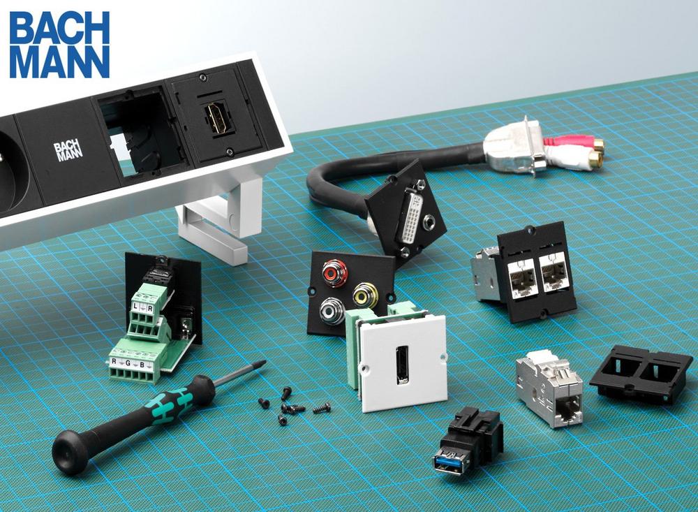 Mehrfachsteckdosen und Anschlussfelder von Bachmann lassen sich durch Custom Module (Keystones) individuell belegen. Leerfelder in den Steckdosen werden flexibel mit Bausteinen für Video-, Audio- und Netzwerkverbindungen ausgestattet. Im Online Shop bachmann24.com sind individuell zusammenstellbare oder vorkonfigurierte Custom Module erhältlich.