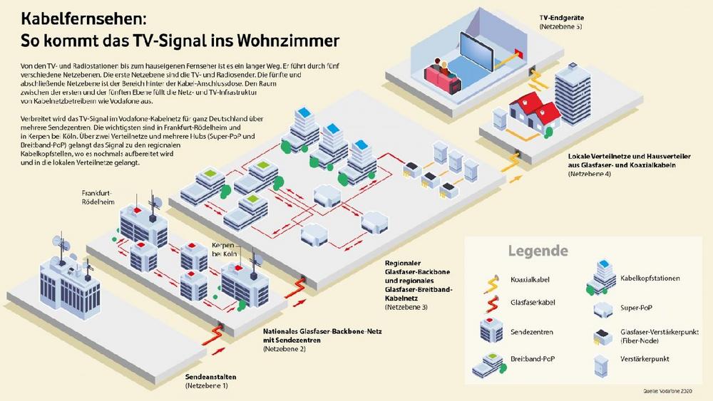 Zur Verbreitung des TV-Signals unterhält Vodafone als größter TV-Anbieter Deutschlands, der 24 Millionen Kabelhaushalte erreicht und fast 14 Millionen TV-Kunden hat, in der zweiten Netzebene insgesamt fünf große Sendezentren. Sie stehen in Frankfurt-Rödelheim, in München, in Kerpen bei Köln, in Stuttgart und in Mannheim und verteilen das Fernsehsignal für ganz Deutschland. Die Sendezentren sind ringförmig miteinander verbunden, so dass ein störungsfreier Fernsehempfang auch dann möglich ist, wenn an einem Standort die Technik beeinträchtig sein sollte.