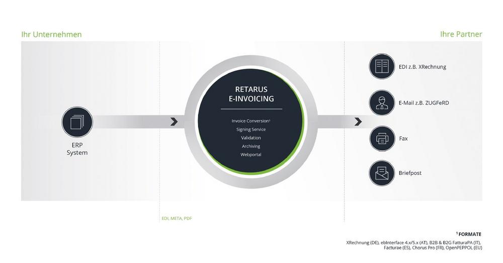 Je stärker das Geschäft eines Unternehmens international ausgerichtet ist, desto komplexer und zahlreicher sind in den jeweiligen Ländern auch die nationalen Vorgaben für E-Invoicing. Mit der Retarus Business Integration Plattform erfüllen Unternehmen nahezu jede beliebige landesspezifische Anforderung, die das E-Invoicing beispielsweise in den Bereichen B2B, B2G und B2C mit sich bringt. Alle Daten werden auch unter dynamischen Bedingungen, wie beispielsweise beim in Ungarn kontinuierlich aktualisierten XML-Wrapper-Format, im vorgegebenen strukturierten Format direkt aus dem ERP-System sicher und zuverlässig an beliebige Empfänger übertragen. Auf Wunsch prüft Retarus alle relevanten Daten vorab. Dies reduziert den Aufwand für Korrekturläufe deutlich. Die leistungsstarken Cloud-Dienste sind flexibel skalierbar und lassen sich auf globaler Ebene jederzeit an neue Anforderungen, etwa bedingt durch internationale Expansion oder neue rechtliche Vorgaben, anpassen. Dabei erfüllt Retarus nationale wie internationale Compliance-Anforderungen und Standards wie beispielsweise XRechnung, Chorus Pro und FatturaPA und ermöglicht als „Certified PEPPOL Access Point“, dass Unternehmen problemlos elektronische Rechnungen an öffentliche Einrichtungen in ganz Europa übermitteln können. Die auditierbaren Retarus-Rechenzentren garantieren ein Höchstmaß an Transparenz hinsichtlich Security, Prozess-Sicherheit und Compliance. Bei Bedarf bietet der Cloud-Anbieter auch eine komfortable, rechtskonforme Langzeit-Archivierung von digitalen Rechnungen an.
