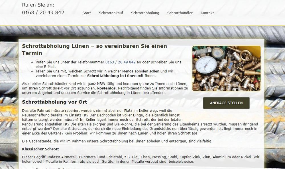 Der Kunde vereinbart einen Termin zur Schrottabholung in Lünen . Der Anbieter fährt zum Kunden, lädt den Schrott auf und transportiert ihn ab. Vor allem schwere, große und sperrige Teile sind für Privathaushalte oftmals schwierig selbst abzutransportieren. All das übernehmen die Mitarbeiter. Falls erforderlich, übernehmen sie ebenso die Demontage. Das gesamte Angebot kann von Privatkunden und Firmenkunden kostenlos genutzt werden.