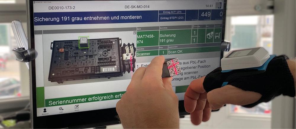 Schrittbezogen werden Aspekte nicht mehr nur auf einem Monitor visualisiert, sondern direkt auf dem NIMMSTA Scanner angezeigt. Vor allem bei größeren Entfernungen ist die Interaktion des Werkerassistenzsystems und des HS 50 sehr effizient, da der Scanner neben der Arbeitsschritt-Info auch als Steuer-und Bedienelement verwendet werden kann. Dies erlaubt eine direkte Dateneingabe in die Werkerassistenzsoftware über das Touch Display. Die Scanfunktion ermöglicht u.a. die Initialisierung von Aufträgen im System oder das Verheiraten und Identifizieren von Bauteilen.