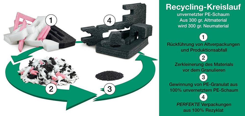 Im Recyclingprozess werden die im Unternehmen anfallenden Schaumstoffreste zerkleinert und anschließend granuliert. Die Verwendung von Resten aus der PE-Schaumstoffverarbeitungen garantiert, dass sich nahezu keine Fremdstoffe im Material befinden. „Nur durch das Recycling mit einer sehr hohen stofflichen Reinheit kann gewährleistet werden, dass das gewonnene Granulat eine ausreichende Qualität besitzt, um daraus wieder PE-Schaum zu produzieren, dessen Materialeigenschaften den technischen Ansprüchen genügen“, berichtet Schlierkamp. Durch die Vorsortierung wird eine Reinheit von 97 Prozent angestrebt, so dass die Qualität des Recycling-Materials nur minimal von der des ursprünglichen Thermoplasts abweicht. „Wird ein herkömmliches PE-LD-Granulat auf Erdölbasis für die Schäumung hergestellt, sind für die Erzeugung eines Kilogramms Granulat ca. Zwei Kilogramm Erdöl nötig. Unser Recyclingschaum mit einem Anteil von 100% Rezyklat aus unserer Verwertung kann natürlich komplett darauf verzichten“, erklärt Schlierkamp weiter. „Pro Schicht erzeugen wir auf diese Weise eine Tonne Granulat, das gesammelt und anschließend von einem Partnerunternehmen zu PE-LD-Platten aufgeschäumt wird.“ Die Kostenersparnis im Vergleich zu erdölgebundenem Granulat beläuft sich auf etwa 5 bis 10 Prozent. Durch die Installation einer Solaranlage auf dem Dach der Produktionshalle, aus der die Recyclinganlage gespeist wird, gelang es Stephan Schaumstoffe den Prozess CO2-neutral zu gestalten. „Überschüssige Energieerträge werden in der regulären Produktion verbraucht oder in das Stromnetz eingespeist. Diesen Überschuss können wir im Winter oder an sonnenarmen Tagen abrufen, um auch dann energieautark recyceln zu können“, zeigt Schlierkamp weitere grüne Vorteile auf.