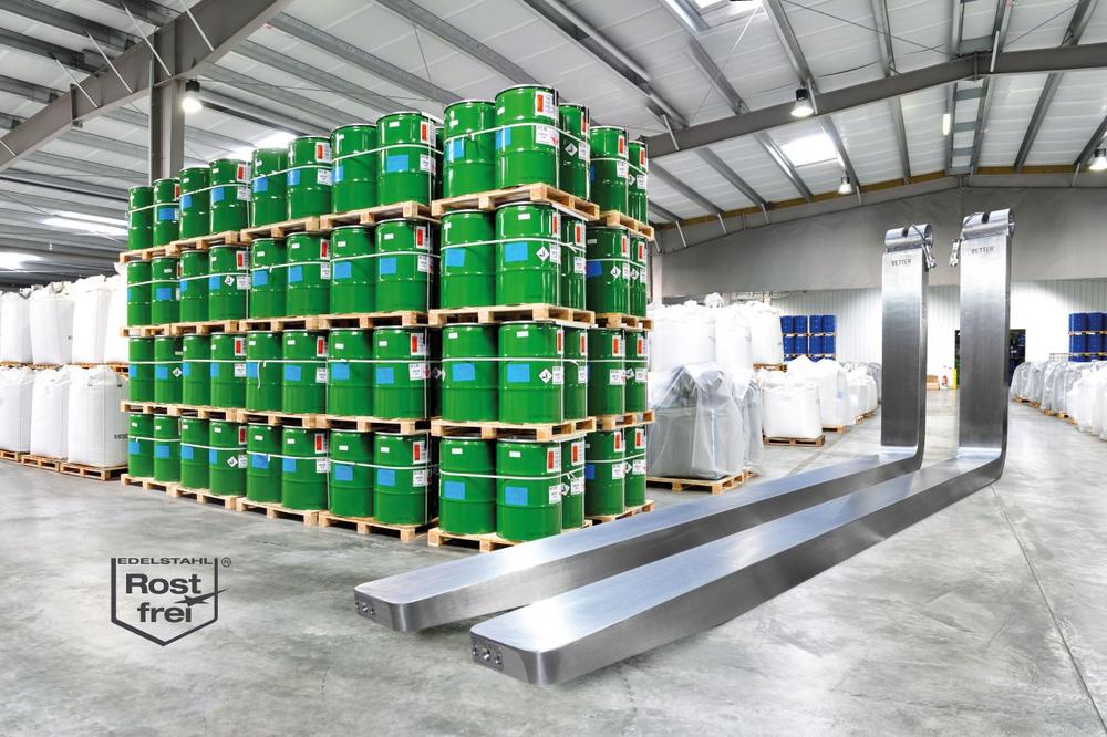 Bisher hat das Unternehmen „normale“ Gabelzinken mit Edelstahl-Ummantelung (Blechbeschichtung) eingesetzt, diese Beschichtungen waren auf Grund des schnellen Verschleißes oft auszuwechseln. Die Lösung: eine Gabelzinke aus Edelstahl-Vollmaterial. Hier kann Vetter auf den Hochleistungswerkstoff VQ46 zurückgreifen, der ausgelegt ist auf die Nutzung in der geforderten Ex-Zone.