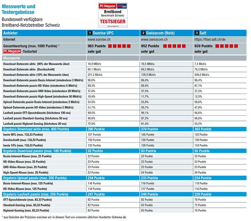 Die Fachzeitschrift PC Magazin und ihr Netztest-Partner umlaut haben zum zweiten Mal einen umfassenden Breitband-Benchmark in der Schweiz durchgeführt. Dabei wurde die im Heimnetzwerk erfahrene Internet-Performance in ihrer Gesamtheit untersucht – so spiegelt der Benchmark das Nutzererlebnis realistisch wider. Neben tarifbedingten Geschwindigkeitseinschränkungen können dabei die technische Ausstattung auf Nutzerseite sowie die von den Netzbetreibern bereitgestellten WLAN-Router eine Rolle spielen. Das Ergebnis: Sunrise UPC holt den Gesamtsieg mit 963 von 1.000 Punkten und der Note „sehr gut“. Swisscom belegt den zweiten Platz mit 952 von 1.000 Punkten und ebenfalls der Note „sehr gut“. Salt behauptet sich mit mit 939 von 1.000 Punkten, ein auch mit „sehr gut“ bewertetes Gesamtergebnis.