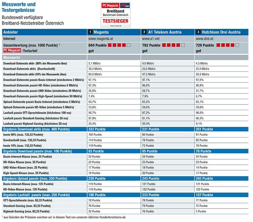 „Alles beim Alten in Austria: Obwohl umlaut sein Crowdsourcing-Testverfahren weiterentwickelt hat und auch die Anforderung an die Netzbetreiber gestiegen sind, hat sich im Ranking auf Bundesebene gegenüber dem Vorjahr nichts verändert. Magenta sichert sich den Gesamtsieg in unserem Breitband-Benchmark. Zu der Bestnote ‚sehr gut‘ fehlen gerade mal zehn Punkte. Platz zwei geht an A1 Telekom Austria und damit an den Netzbetreiber mit der klar höchsten Samplezahl und der besten Reichweite. Hutchison Drei erreicht als Drittplatzierter ebenfalls die Gesamtnote ‚gut‘, vor allem dank seiner hohen Datenraten“, sagt Joachim Bley, Autor des PC Magazins.