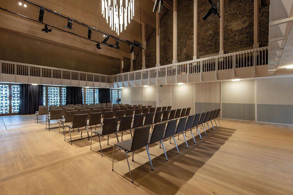 In diesem Zuge sollte auch eine neue Bühne im Gemeindesaal installiert werden, welche eine festliche und funktionale Atmosphäre darstellen soll sowie den Gemeindesaal multifunktional einsetzen lässt. Da die Platzverhältnisse insgesamt sehr eng sind, kam eine klassische mobil auf- und abbaubare Bühne nicht in Frage. Stattdessen sollte die Bühne als Festinstallation im Saal versenkbar sein, so dass die Fläche im Gemeindesaal auch im eingefahrenen Zustand der Bühne im Gemeindesaal u.a. für Tagungen, Hochzeiten, Banketts etc. genutzt werden kann. Anders ausgedrückt: die Bühne sollte in der Größe und in der Höhe flexibel einsetzbar sein und vor allem im Boden komplett versenkt werden.