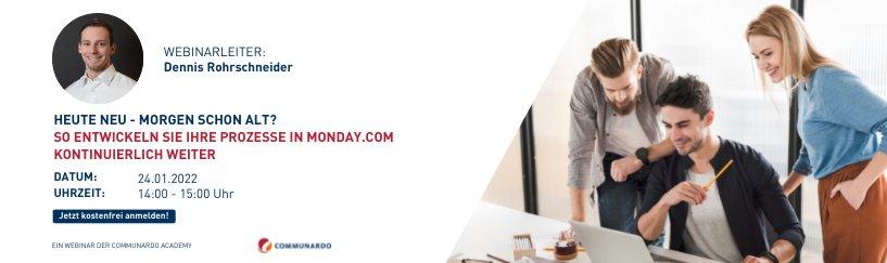 24.01.2022 Kostenfreies Live Webinar: Heute neu – morgen schon alt? So entwickeln Sie Ihre Prozesse in monday.com kontinuierlich weiter.