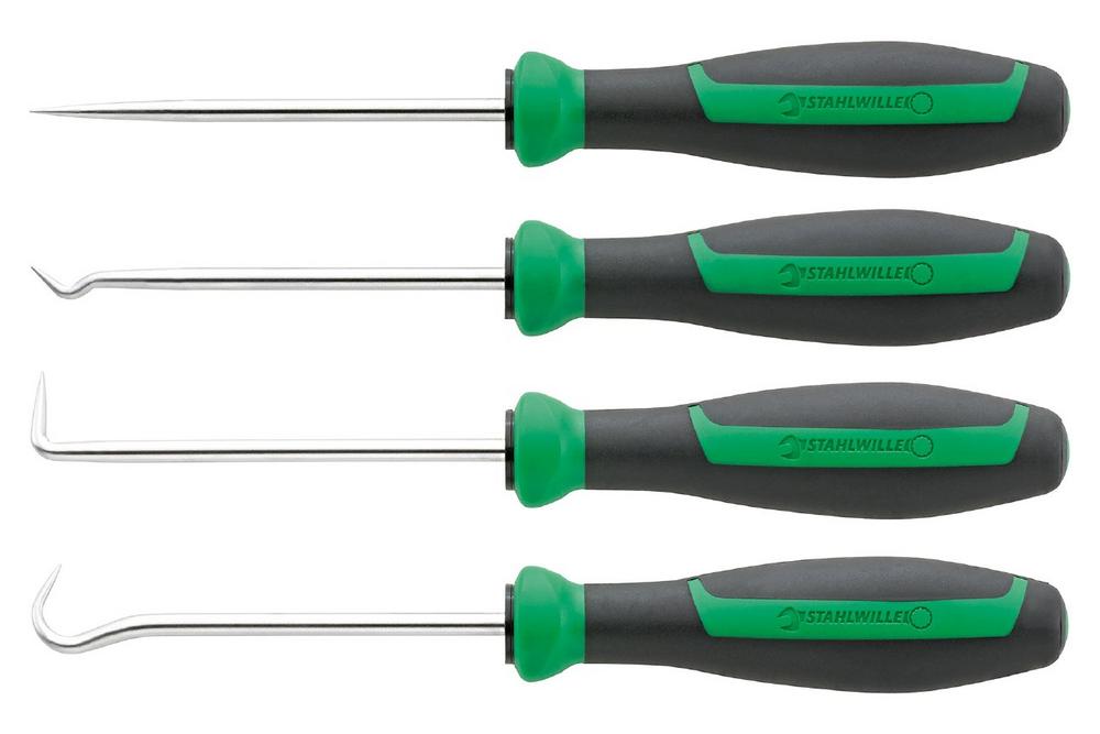 Vier verschiedene Hakenwerkzeuge, die besonders häufig zum Einsatz kommen, bietet Stahlwille als Set an. Die Werkzeuge mit gerader Spitze, rundgebogen sowie mit 45 bzw. 90 Grad abgewinkelter Spitze sind hochwertig verarbeitet und hergestellt in Deutschland. Mit ihrem Zwei-Komponenten-Ballengriff liegen sie sicher und komfortabel in der Hand, was eine präzise Führung ermöglicht.