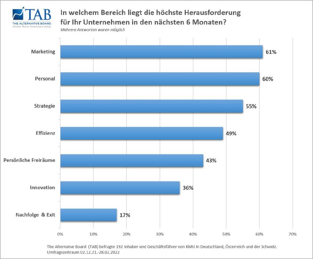 Die Umfrage hat The Alternative Board (TAB) vom 2. Dezember 2021 bis 28. Februar 2022 unter Mitgliedern von Unternehmerboards durchgeführt. Befragt wurden 192 Firmenchefs von KMU in Deutschland, Österreich und der Schweiz.