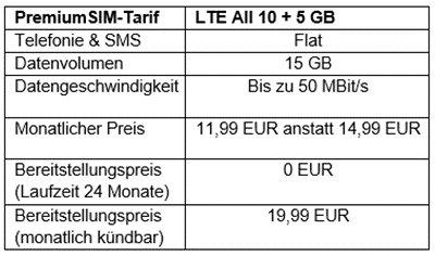 Der Aktionstarif LTE All 10 + 5 GB von PremiumSIM enthält neben dem Inklusiv-Datenvolumen von 15 GB eine Flatrate für Telefonie und SMS sowie EU-Roaming. Die PremiumSIM-Aktion ist bis zum 28. Juni 2022 um 11 Uhr verfügbar.