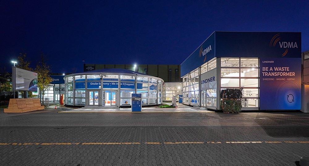 An 23 Aufbautagen wurden schließlich im Außengelände auf einer Fläche von 4700 Quadratmetern 10 Pavillons aufgebaut, in denen live die Technologien der Mitglieder gezeigt wurden. Im Zentrum des Circular Economy Forums stand der 300 qm große DOME, Treffpunkt für Informationen und fachlichen Austausch rund um die Kreislaufwirtschaft. Dort kam auch „die Maschine“ wieder zum Einsatz, die es möglich machte an einem zentralen Punkt über 40 VDMA Mitgliedsunternehmen zu entdecken und die einzelnen Prozessschritte der Kreislaufwirtschaft zu erleben.