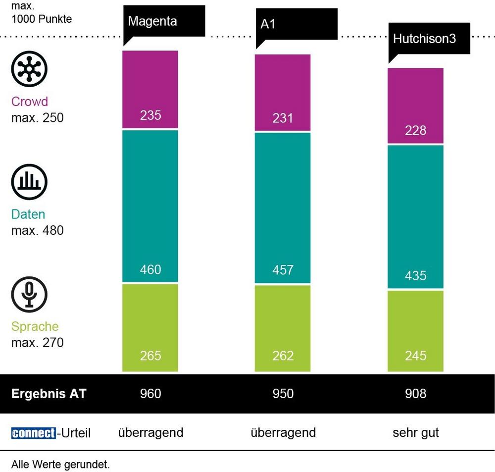 Hannes Rügheimer, connect-Autor, resümiert: „Im fünften Jahr in Folge sehen wir in unserem anspruchsvollen Mobilfunktest eine vertraute Rangfolge in Österreich, in Deutschland und der Schweiz. Wir bauen unsere Testmethodik immer weiter aus und verschärfen die Bewertungsschlüssel von Jahr zu Jahr. Die guten Ergebnisse zeigen, dass jeder Anbieter kontinuierlich sein Netz verbessert.“