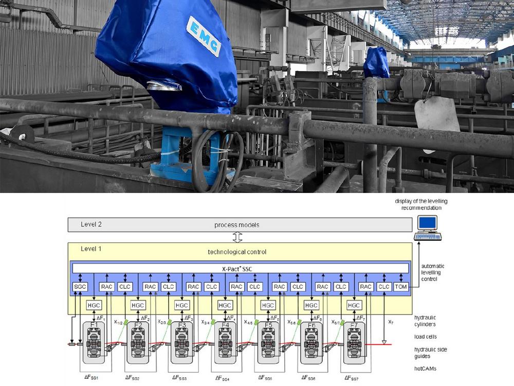 Im konkreten Anwendungsfall besteht die beschriebene Bandlaufregelung in der Warmbandstraße aus zwei wesentlichen Modulen. Dies ist zum einen die EMG hotCAM-Lösung (mit einer oder mehreren Kameras) selbst und zum anderen die automatisierte Regelung – in Form der ALC (Automatic Levelling Control) der  SMS group – zur automatisierten Optimierung der Bandlage und Verbesserung des Walzprozesses. Ein Prinzipbild für die kombinierte automatische Bandlagenregelung ist im unteren Teil der Abbildung wiedergegeben.