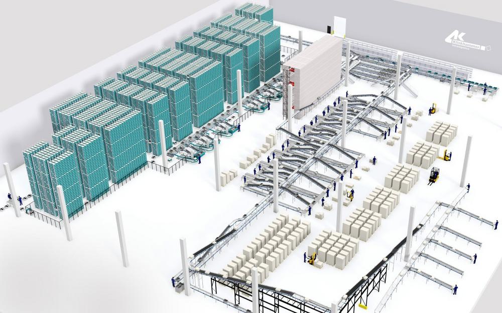Über ein leistungsfähiges Fördertechniksystem ist das Exotec Lager mit einem doppelttiefen, eingassigen Shuttlesystem mit 2 Hebern verbunden. Dieses dient als Auftragszusammenführungspuffer für Aufträge, die aus mehreren Behältern aus separaten Kommissionierbereichen bestehen. Jede der 18 Ebenen verfügt über ein eigenes Shuttle, wodurch auf ein Shuttle-Roaming verzichtet und die Leistungsfähigkeit maximal ausgenutzt werden kann. Innerhalb des Shuttle-Systems werden die Behälter der mehrbehältrigen Aufträge gesammelt, bis der Auftrag komplett ist und anschließend zum Packplatz transportiert wird. Gleichzeitig dient das Shuttle-System als Leerbehälterspeicher, um Auslastungsschwankungen zwischen Kommissionierung und Packerei auszugleichen. Die Packerei mit 30 Arbeitsplätzen teilt die Warenströme in Großaufträge und Paketaufträge. Zur Verteilung der fertig gepackten Pakete auf die verschiedenen Transportdienstleister wird ein Versandsorter eingesetzt, der die Pakete zum richtigen LKW-Tor ausschleust.