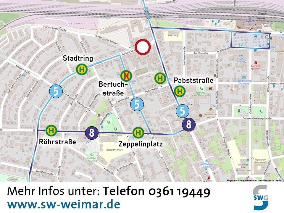 Die Linie 8 verkehrt im Umleitungszeitraum über die Röhrstraße und die Ernst-Thälmann-Straße. Dadurch entfällt die Haltestelle „Bertuchstraße“ in beide Richtungen. Als Ersatz dafür dient die Haltestelle „Pabststraße“.