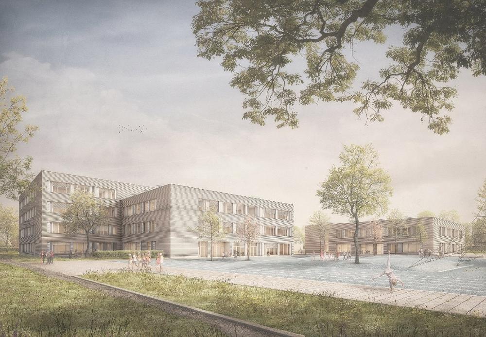 Keine leichte Aufgabe für das Nürnberger Hochbauamt, die beteiligten Fachplaner sowie die Schüler- und Lehrerschaft: Denn errichtet werden die beiden eigenständigen Neubauten für Schule und Hort bei laufendem Schulbetrieb. Der aktuell auf dem über 27.000 Quadratmeter großen Grundstück bei Schweinau befindliche zweigeschossige Schulbau aus den 70er Jahren bleibt zunächst erhalten und wird erst nach der Fertigstellung der beiden Neubauten abgerissen. Bestehen bleibt dagegen der im südlichen Bereich des Grundstücks angesiedelte denkmalgeschützte 30er-Jahre-Schulbau.