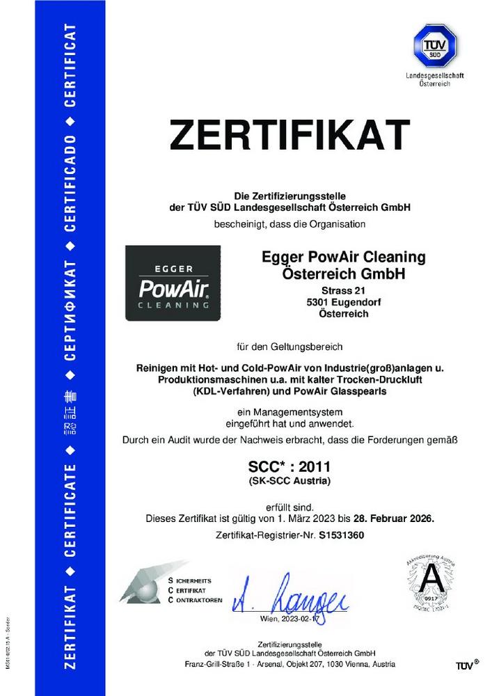 Industriemaschinenreiniger Egger PowAir Cleaning GmbH von TÜV – SÜD bis 2026 SCC* : 2011 zertifiziert.