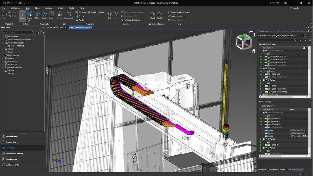 Das richtige Kabel finden, planen und den Verlauf für die Montage darstellen? Bislang war das im Maschinenbau ein mühevoller Prozess für den Elektrokonstrukteur. Jetzt hat Lösungsanbieter Eplan seine 3D-Software Eplan Harness proD auf die Praxisanforderungen der Maschinenverkabelung im Feld erweitert. Was im Umfeld der Mechanik längst Standard ist, zieht nun im Elektro-Engineering ein – der digitale Zwilling der Verkabelung. In Eplan Harness proD abgebildet ist diese eindeutige Produktdatenquelle sowohl für die Fertigung als auch für Montage und Service nutzbar – in Kombination von Elektrotechnik und Mechanik. Die gemeinsame Artikeldatenbank der Eplan Systeme sichert eine eindeutige Datenquelle. Deutlicher Praxisvorteil: Die Konstrukteure arbeiten in ihrer eigenen Arbeitsweise mit jeweils eigener Sicht auf die Maschine: Die Mechanik denkt weiter in Baugruppen (Assemblies) – die Elektrotechnik in Funktionen.