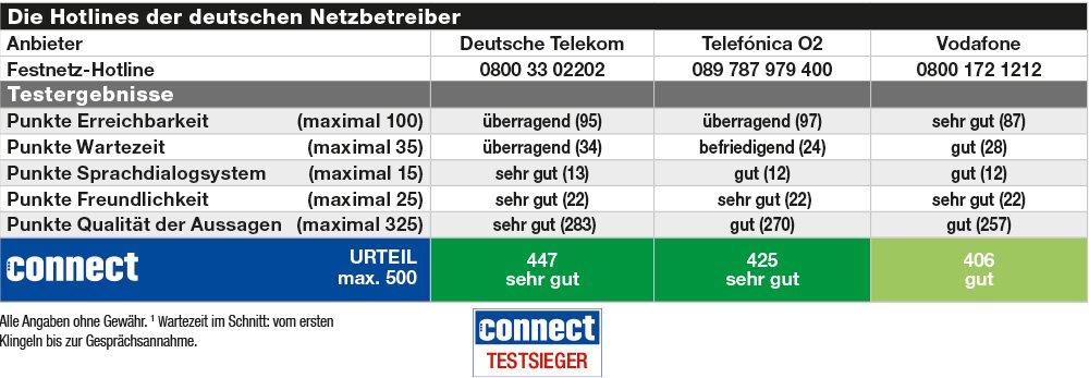 Die Deutsche Telekom ist erneut Spitzenreiter in Deutschland und erzielt mit 447 von 500 Punkten die Note „sehr gut“. Der Anbieter überzeugt mit einer hohen Kundenorientierung, kompetenter Beratung sowie sehr kurzen Wartezeiten. Mit 425 Punkten folgt Telefónica O2 auf Platz zwei und steigert sein connect-Urteil „gut“ im Vorjahr auf „sehr gut“. Die Beratung ist professionell und die Erreichbarkeit der Hotline überragend; die Tester wurden bei nahezu allen Anrufen im ersten Versuch durchgestellt. Vodafone erreicht Platz drei mit 406 Punkten und damit das Urteil „gut“. Im Vorjahresvergleich verbessert der Anbieter seine Erreichbarkeit und auch die Wartezeit sank um über eine Minute. Bei der Beratungskompetenz hingegen ist noch Luft nach oben.