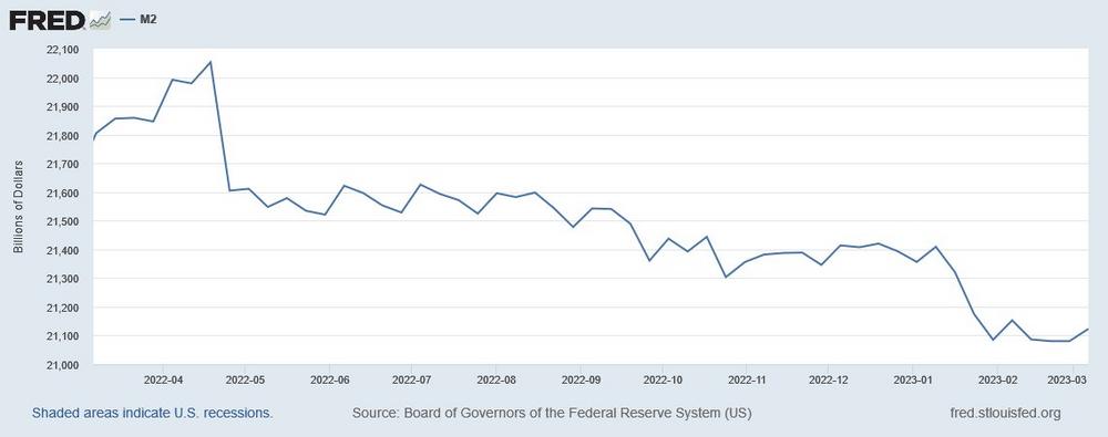 Dem gegenüber ist die Geldmenge in den USA so schnell gesunken, wie seit den 1930er Jahren nicht mehr, was ein Warnsignal für die Wirtschaft und die Finanzmärkte darstellt. So ist die Geldmenge M2 im Februar gegenüber dem Vorjahreszeitraum um nicht saisonbereinigte 2,2 % auf 21,099 Billionen US-Dollar gesunken. Die Geldmenge M2 ist ein Maßstab dafür, wie viel Bargeld und bargeldähnliche Vermögenswerte in der US-Wirtschaft im Umlauf sind. Demnach müsste die FED die Zinserhöhungen bald einstellen, da Wachstum, Vermögenspreise und vor allem die hohe Inflation sich abschwächen sollten. Insgesamt steht es also um den gesamtwirtschaftlichen Zustand, vor allem dem der USA, nicht besonders gut. Wie sich die Aktienmärkte und besonders die Bankenwerte in naher Zukunft entwickeln, bleibt abzuwarten. Angesichts der hohen Staatsverschuldung und der gesunkenen Geldmenge mit einem möglichen Rückgang von Wachstum ist ein Investment in Bankaktien, besonders von US-Banken, aktuell ziemlich risikobehaftet.