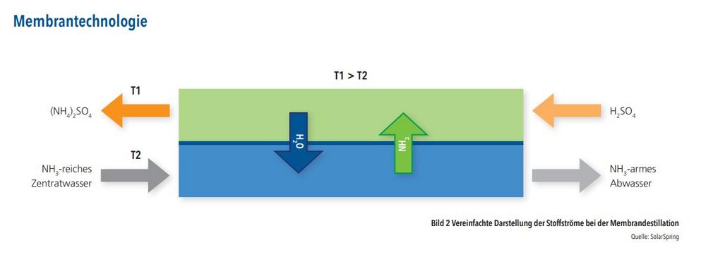 Bei der Membrandestillation handelt es sich um ein thermisch getriebenes Trennverfahren, bei dem hydrophobe, semipermeable Membranen zur Separation eines Abwasserstroms verwendet werden. Die selektiven Eigenschaften dieser Membran beruhen hierbei auf dem Rückhalt von flüssigem Wasser, während Wasserdampf und andere flüchtige Stoffe (wie in diesem Falle Ammoniak) durch die Membran permeieren. Die Triebkraft des Prozesses liegt in den Dampfdruckdifferenzen aufgrund der Temperaturunterschiede zwischen Feed (Abwasser) und Permeat-Seite.