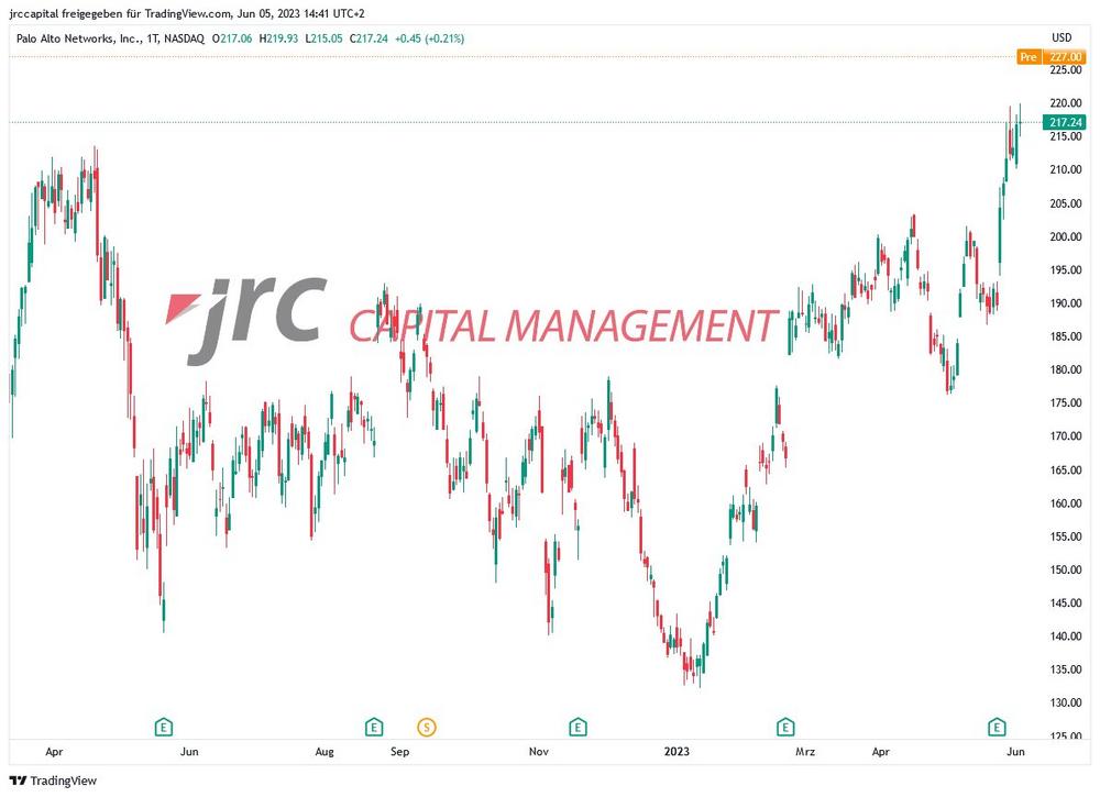Da die Palo Alto Inc. am 23.Mai wie zahlreiche Quartale vorher mit guten Geschäftsergebnissen überzeugen konnte, sollten Anleger die Aktie im Auge behalten. Der Gewinn war an diesem Tag über 17% höher als der erwartete Wert ausgefallen und auch die Umsatzerwartung wurde leicht übertroffen. Sollte der Tech-Sektor also weiterhin so positiv wie bisher performen, könnte dies auch einen höheren Umsatz für Cybersicherheitsunternehmen wie Palo Alto bedeuten. Zwar zahlt das Unternehmen keine Dividende, allerdings wäre ein Anstieg Richtung der 240-US-Dollar-Marke wahrscheinlich. Andernfalls könnte der Kurs zur letzten Unterstützung bei 212 US-Dollar korrigieren.