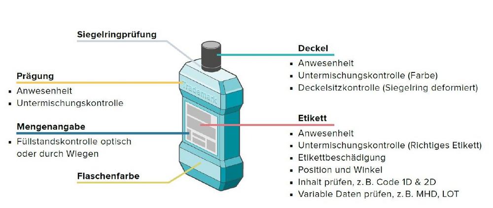 Hochpräzise Kameras liefern der Software alle Informationen um Anwesenheit, Farbe, Position, Winkel und Form auszuwerten und sogar Inhalte wie Codes und Klarschrift zu prüfen. Je nach Kamera position werden damit z. B. der Bereich von Deckel und Siegelring, eine Prägung oder das Etikett inspiziert.