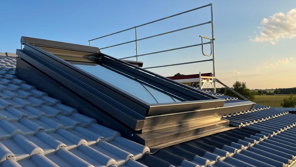 Zudem musste die Verblechung angepasst werden. Für dieses Projekt orderte LiDEKO bei seinem Lieferanten entsprechende Sonderbleche. Ein örtlicher Zimmereibetrieb, der auch das Dach gedeckt hatte, bereitete die sogenannte Auswechslung im Dachstuhl für den Einbau des 1,34 m breiten und 2,54 m hohen „Classic“-Fensters vor. Mitte Juni 2023 wurde das Dach geöffnet und der Aufkeilrahmen aufgesetzt. Anschließend konnte das Fenster per Autokran platziert und montiert werden.