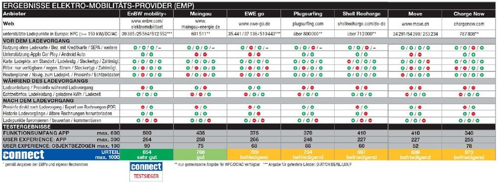 In Deutschland wurden die sechs EMPs ChargeNow, EnBW, EWE go, Maingau, Plugsurfing und Shell Recharge sowie die neun CPOs Allego, Aral Pulse, EnBW, E.ON, EWE Go, Fastned, Ionity, Mer und Shell Recharge getestet. In Österreich wurden die fünf CPOs Da emobil, Ionity, Mer, Shell Recharge und Smatrics EnBW getestet, in der Schweiz der EMP Move und die fünf CPOs Fastned, GoFast, Ionity, Move Mobility und Shell Recharge.