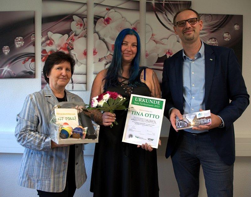 Am 16. September 2025 ehrten Patrick Millies, der Geschäftsführer der Bildungswerk der Sächsischen Wirtschaft gGmbH (bsw), und Rita Bürger, die Leiterin des bsw Bildungs-zentrums Freiberg, eine der bisher erfolgreichsten Teilnehmerinnen, die über eine Teil-qualifikation bis zur Abschlussprüfung vor der regionalen IHK geführt wurde. „Die Tatsache, dass nach Absolvierung aller Module die Zugangsvoraussetzungen für die externe IHK-Abschlussprüfung erfüllt sind, ist ein klarer Weg zur Anerkennung des erworbenen Wissens und der Fähigkeiten“, fasste die Leiterin Rita Bürger während der Ehrung zusammen.