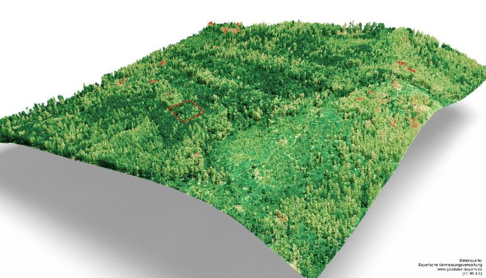 Dank der LIDAR-Daten lässt sich ein exaktes 3D-Modell unseres Waldes erstellen. Auf dieses Modell wird der hochauflösende NDVI projiziert.Das Ergebnis: Eine anschauliche Karte, die sowohl Baumhöhen und Dichten als auch Vitalitätsunterschiede zeigt. Die Vielfalt der Strukturen ist ein klarer Indikator für ein sich entwickelndes, stabiles Ökosystem.
