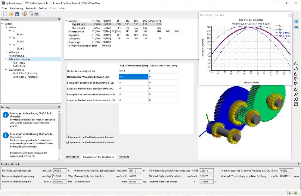 Ein wesentlicher Fortschritt ist die Integration der Welle-Nabe-Berechnungen für Passfeder-, Pressverband- und Zahnwellenverbindungen. Damit können Berechnungen und Daten mit den entsprechenden Einzelmodulen direkt im System verwaltet und ausgetauscht werden. Die eAssistant bzw. TBK-Einzelmodule können dabei direkt in der Systemumgebung geöffnet werden. Ergänzend sorgt ein neues Meldungsfenster für mehr Transparenz, da Hinweise und Ergebnisse aus der Systemberechnung, den Wälzlager- sowie den Zahnrad- und Welle-Nabe-Berechnungen zentral angezeigt werden. Auch die Bedienung wurde optimiert: In der Statusleiste steht nun ein Schalter zur Verfügung, der eine automatische Neuberechnung nach jeder Eingabeänderung ermöglicht. Alle Ergebnisse einschließlich der Grafiken werden unmittelbar aktualisiert, sodass Anwender die Auswirkungen von Parameteränderungen sofort nachvollziehen können.