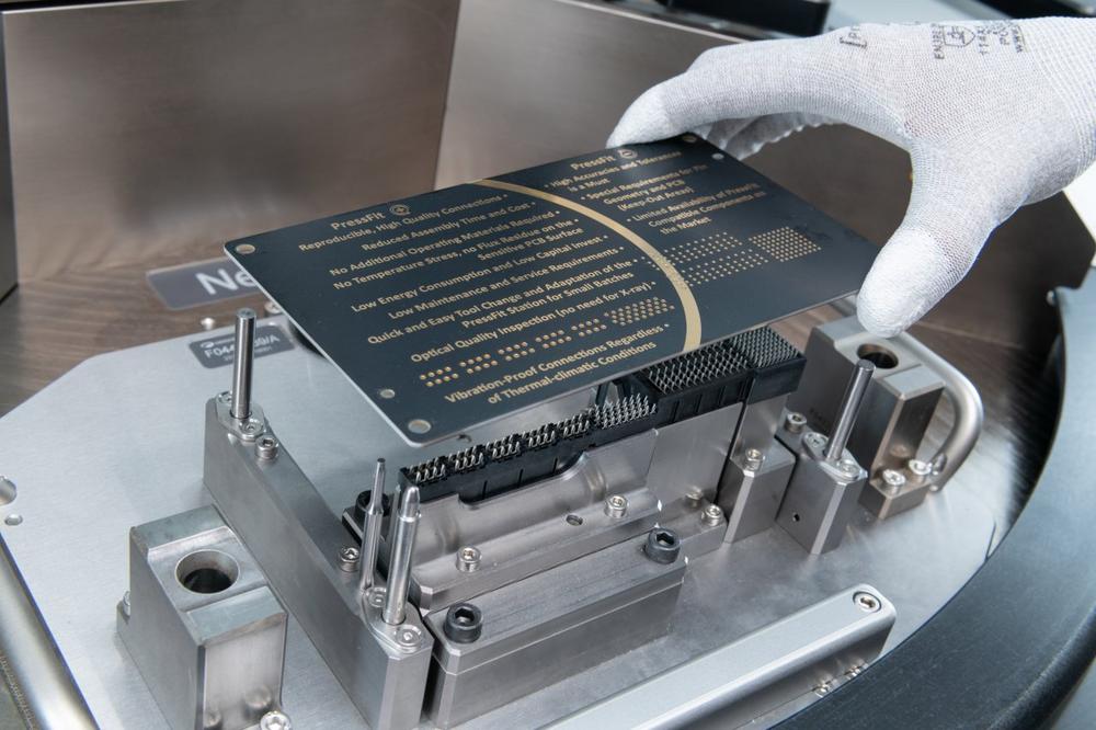Der PressFit-Einpressprozess von GEFASOFT ist eine zuverlässige und qualitativ hochwertige Komplementärtechnologie zum konventionellen Selektivlöten, mit dem Ergebnis einer dauerfesten und formschlüssigen Verbindung von Steckerleisten-Pins mit den metallisierten Bohrungen einer Leiterplatte.